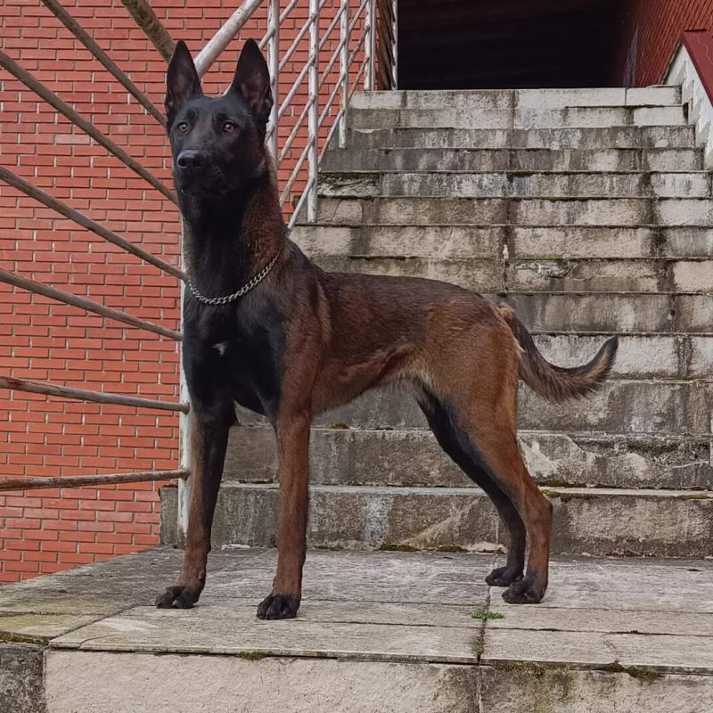 A young female of belgian shepherd malinois, fawn colored with a black mask. Her parents are – sire (father) is Grom Legos Dog Team and damm (mother) is Etna vor der Sole Dog. Her father's side is a working line of IGP sports dogs who participated in FMBB. Here is a female of a larger build in training for IGP 1.